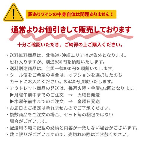 ※※※こちらの商品は、デザイン変更、エチケット(ラベル)破れや汚れ、二重貼りやラベル無し、キャップシール無しなど、外装に損傷や汚れありの商品をアウトレットとして販売しております。そのため、上記の理由とする返品につきましてはご対応いたしかねます。予めアウトレット品であることを十分ご了承いただいた上でご注文をお願申し上げます。※※※