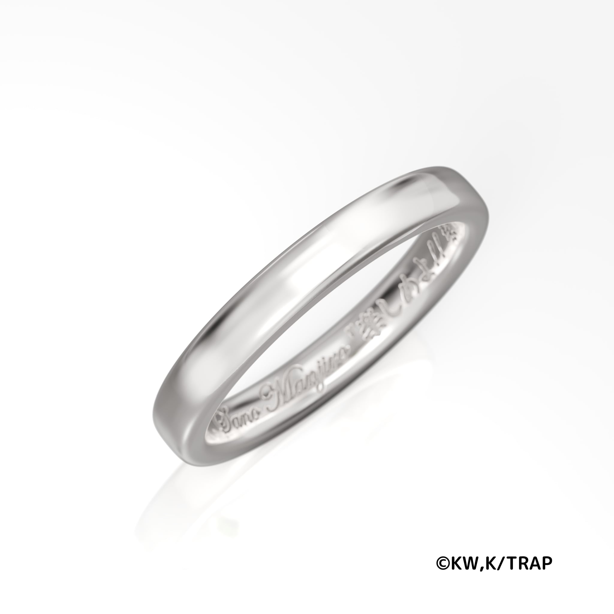 内側に名前とセリフを刻み、マイキーの誕生石であるペリドットを埋め込んだ、シンプルで日常使いしやすいデザインです。